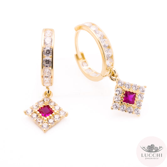 Square Drop Halo Huggies Earrings - White & Red -14k