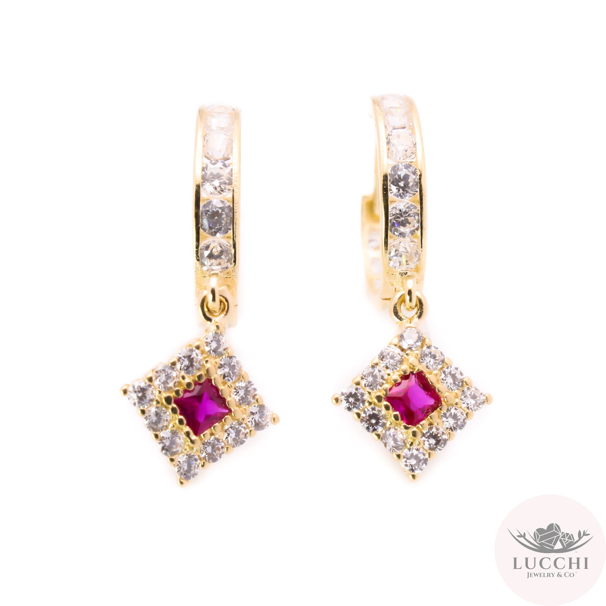 Square Drop Halo Huggies Earrings - White & Red -14k