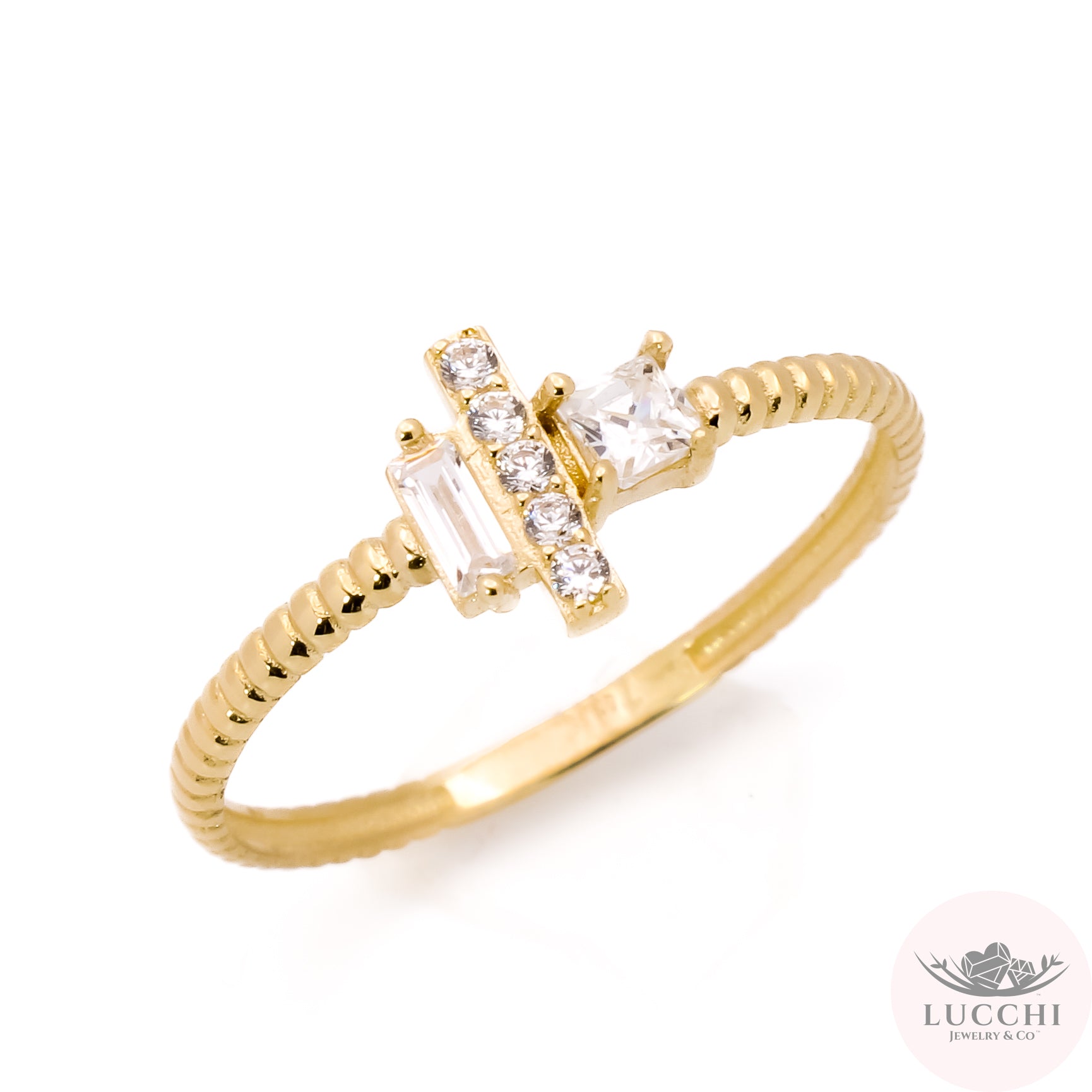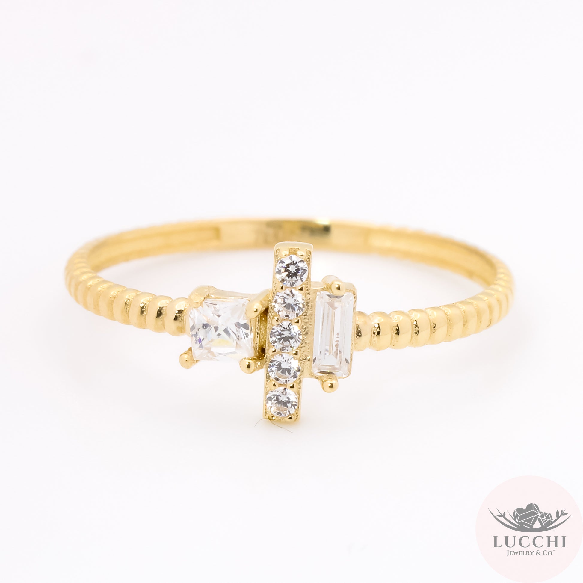 Brilliant, Princess, & Emerald cut stones all in one. Grooves all around.